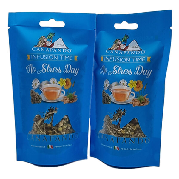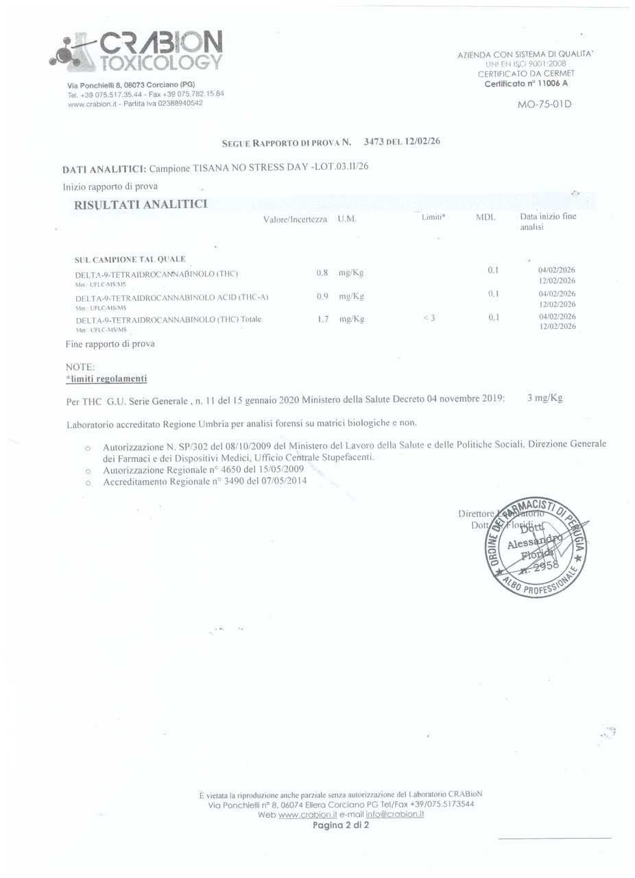 Tisana terapeutica composta da erbe officinali come: eleuterococco, escolzia, iperico, camomilla e fiori di canapa. Usata per regolare i cigli del cortisolo: quest’ultimo è attivo normalmente dalle 8 del mattino alle 5.30 di sera. Nelle persone fortemente stressate o sotto agitazione, panico o perché trascorrono parte gran parte della giornata a contatto con dispositivi quali: Pc, smartphone e tablet; tendono a produrre più cortisolo del normale giacchè viene alterato il normale ritmo circadiano, determinando così riduzione della massa ossea, muscolare e delle difese immunitarie ed aumento del tessuto adiposo.